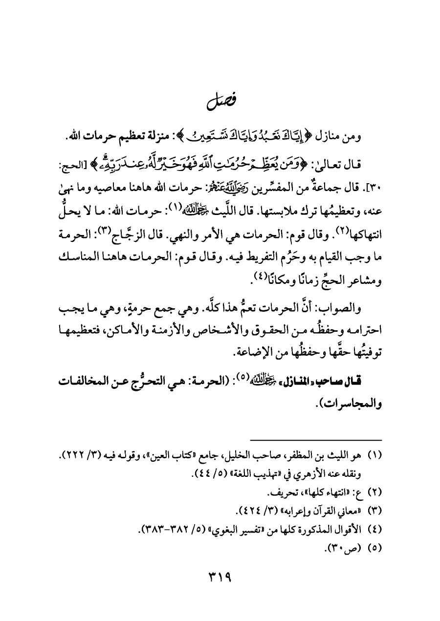 ومن منازل {إِيَّاكَ نَعْبُدُ وَإِيَّاكَ نَسْتَعِينُ}: منزلة تعظيم حرمات الله.