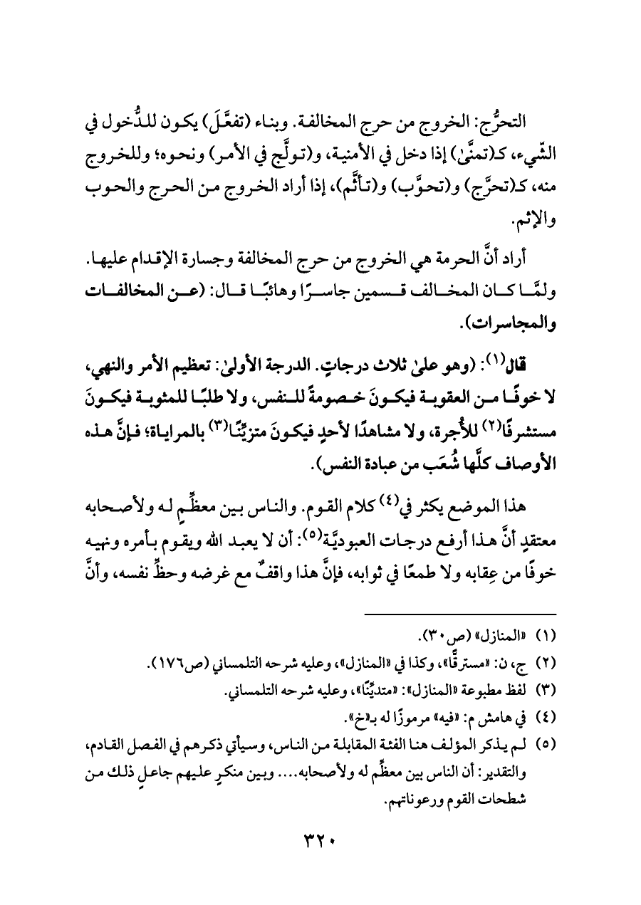 قال (¬١): (وهو على ثلاث درجاتٍ. الدرجة الأولى: تعظيم الأمر والنهي، لا خوفًا من العقوبة فيكونَ خصومةً للنفس، ولا طلبًا للمثوبة فيكونَ مستشرفًا (¬٢) للأُجرة، ولا مشاهدًا لأحدٍ فيكونَ متزيِّنًا (¬٣) بالمراياة؛ فإنَّ هذه الأوصاف كلَّها شُعَب من عبادة النفس).