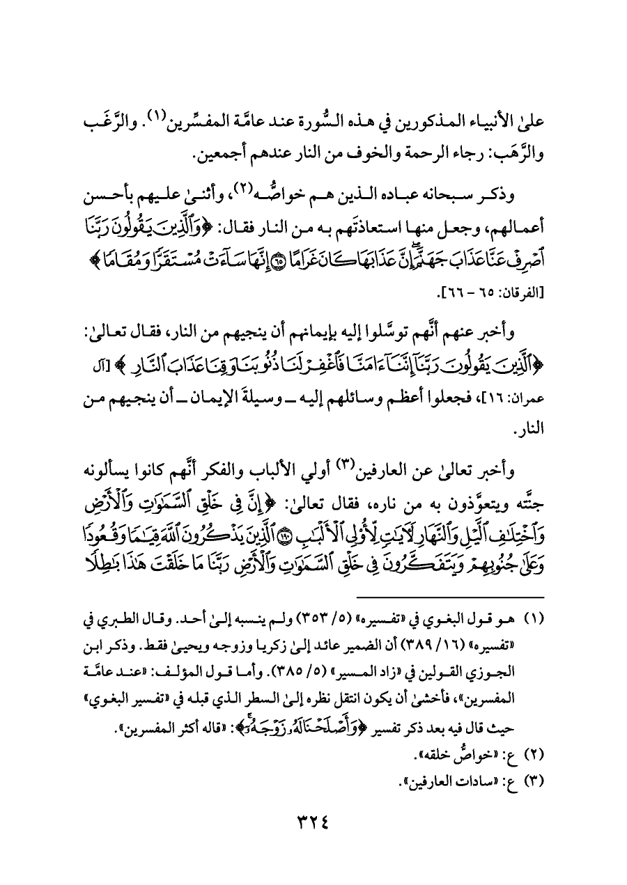 (¬١) هو قول البغوي في «تفسيره» (٥/ ٣٥٣) ولم ينسبه إلى أحد. وقال الطبري في «تفسيره» (١٦/ ٣٨٩) أن الضمير عائد إلى زكريا وزوجه ويحيى فقط. وذكر ابن الجوزي القولين في «زاد المسير» (٥/ ٣٨٥). وأما قول المؤلف: «عند عامَّة المفسرين» , فأخشى أن يكون انتقل نظره إلى السطر الذي قبله في «تفسير البغوي» حيث قال فيه بعد ذكر تفسير {وَأَصْلَحْنَا لَهُ زَوْجَهُ}: «قاله أكثر المفسرين».