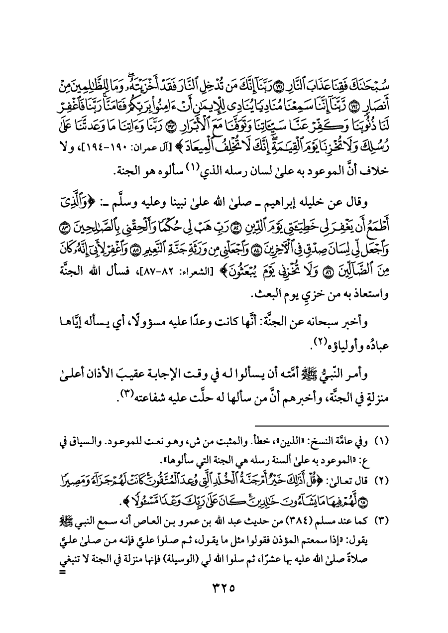 سُبْحَانَكَ فَقِنَا عَذَابَ النَّارِ (١٩١) رَبَّنَا إِنَّكَ مَنْ تُدْخِلِ النَّارَ فَقَدْ أَخْزَيْتَهُ وَمَا لِلظَّالِمِينَ مِنْ أَنْصَارٍ (١٩٢) رَبَّنَا إِنَّنَا سَمِعْنَا مُنَادِيًا يُنَادِي لِلْإِيمَانِ أَنْ آمِنُوا بِرَبِّكُمْ فَآمَنَّا رَبَّنَا فَاغْفِرْ لَنَا ذُنُوبَنَا وَكَفِّرْ عَنَّا سَيِّئَاتِنَا وَتَوَفَّنَا مَعَ الْأَبْرَارِ (١٩٣) رَبَّنَا وَآتِنَا مَا وَعَدْتَنَا عَلَى رُسُلِكَ وَلَا تُخْزِنَا يَوْمَ الْقِيَامَةِ إِنَّكَ لَا تُخْلِفُ الْمِيعَادَ} [آل عمران: ١٩٠ - ١٩٤]، ولا خلاف أنَّ الموعود به على لسان رسله الذي (¬١) سألوه هو الجنة.