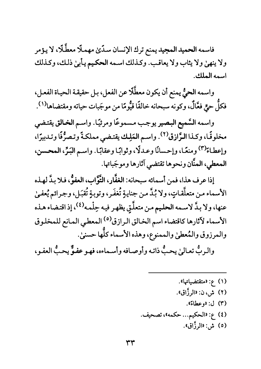 إذا عرف هذا، فمن أسمائه سبحانه: الغفَّار، التَّوَّاب، العفوُّ، فلا بدَّ لهذه الأسماء من متعلَّقاتٍ، ولا بُدَّ من جنايةٍ تُغفَر، وتوبةٍ تُقبَل، وجرائم يُعفى عنها، ولا بدَّ لاسمه الحليم من متعلَّقٍ يظهر فيه حِلْمه (¬٤)، إذ اقتضاء هذه الأسماء لآثارها كاقتضاء اسم الخالق الرازق (¬٥) المعطي المانع للمخلوق والمرزوق والمُعطى والممنوع، وهذه الأسماء كلُّها حسنى.
