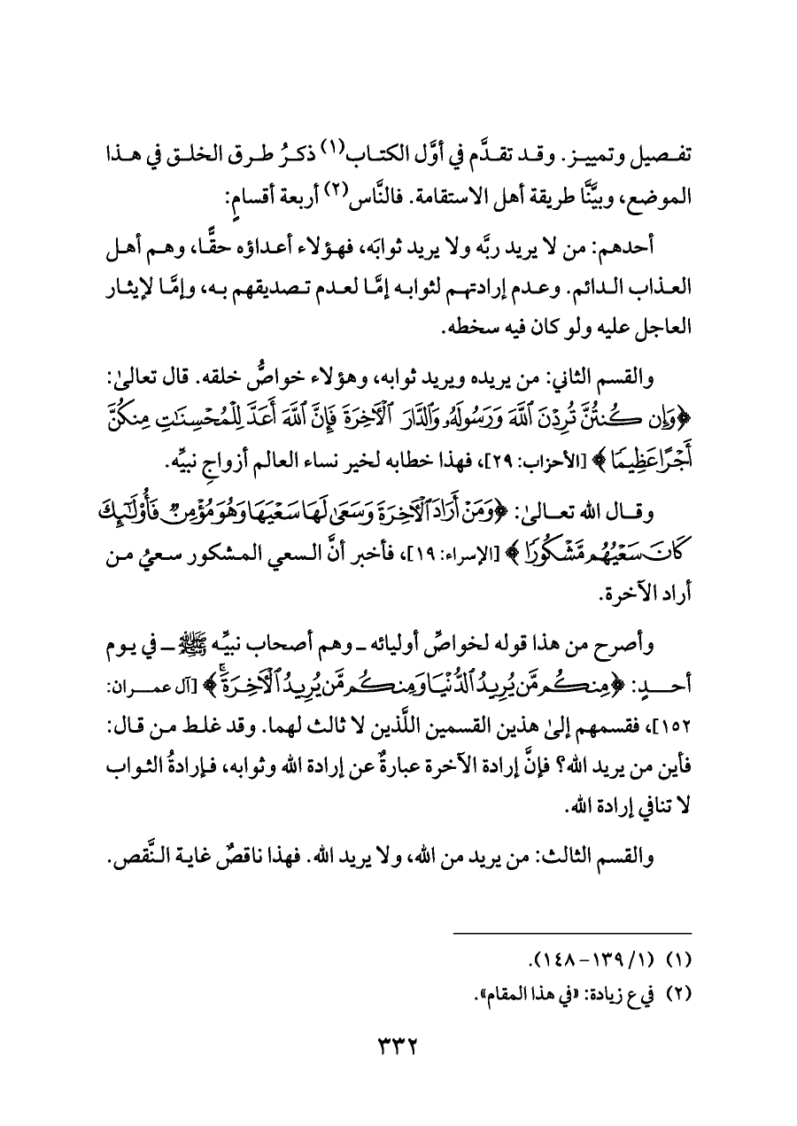 وأصرح من هذا قوله لخواصِّ أوليائه ــ وهم أصحاب نبيِّه - صلى الله عليه وسلم - ــ في يوم أحدٍ: {مِنْكُمْ مَنْ يُرِيدُ الدُّنْيَا وَمِنْكُمْ مَنْ يُرِيدُ الْآخِرَةَ} [آل عمران: ١٥٢]، فقسمهم إلى هذين القسمين اللَّذين لا ثالث لهما. وقد غلط من قال: فأين من يريد الله؟ فإنَّ إرادة الآخرة عبارةٌ عن إرادة الله وثوابه، فإرادةُ الثواب لا تنافي إرادة الله.