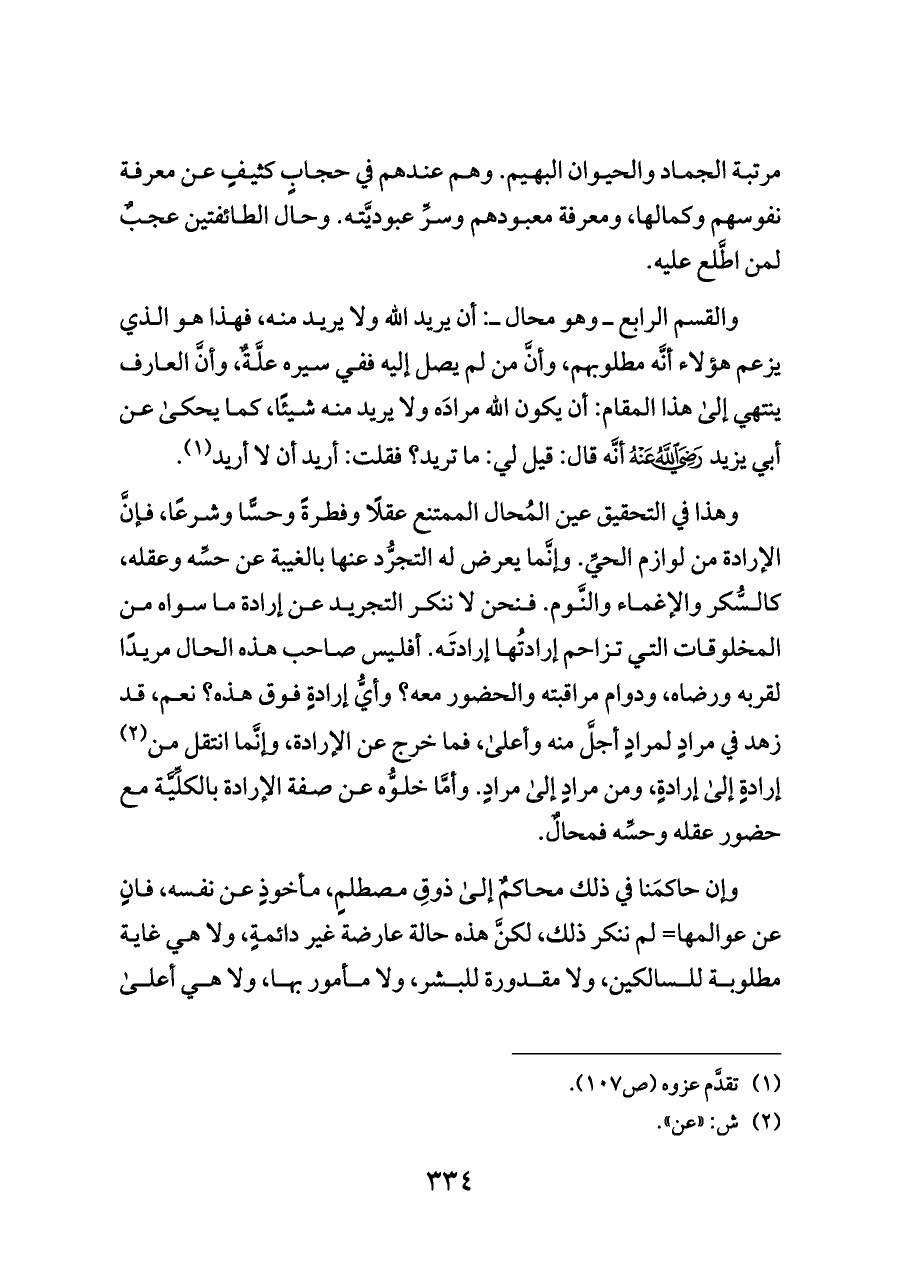 وهذا في التحقيق عين المُحال الممتنع عقلًا وفطرةً وحسًّا وشرعًا، فإنَّ الإرادة من لوازم الحيِّ. وإنَّما يعرض له التجرُّد عنها بالغيبة عن حسِّه وعقله، كالسُّكر والإغماء والنَّوم. فنحن لا ننكر التجريد عن إرادة ما سواه من المخلوقات التي تزاحم إرادتُها إرادتَه. أفليس صاحب هذه الحال مريدًا لقربه ورضاه، ودوام مراقبته والحضور معه؟ وأيُّ إرادةٍ فوق هذه؟ نعم، قد زهد في مرادٍ لمرادٍ أجلَّ منه وأعلى، فما خرج عن الإرادة، وإنَّما انتقل من (¬٢) إرادةٍ إلى إرادةٍ، ومن مرادٍ إلى مرادٍ. وأمَّا خلوُّه عن صفة الإرادة بالكلِّيَّة مع حضور عقله وحسِّه فمحالٌ.