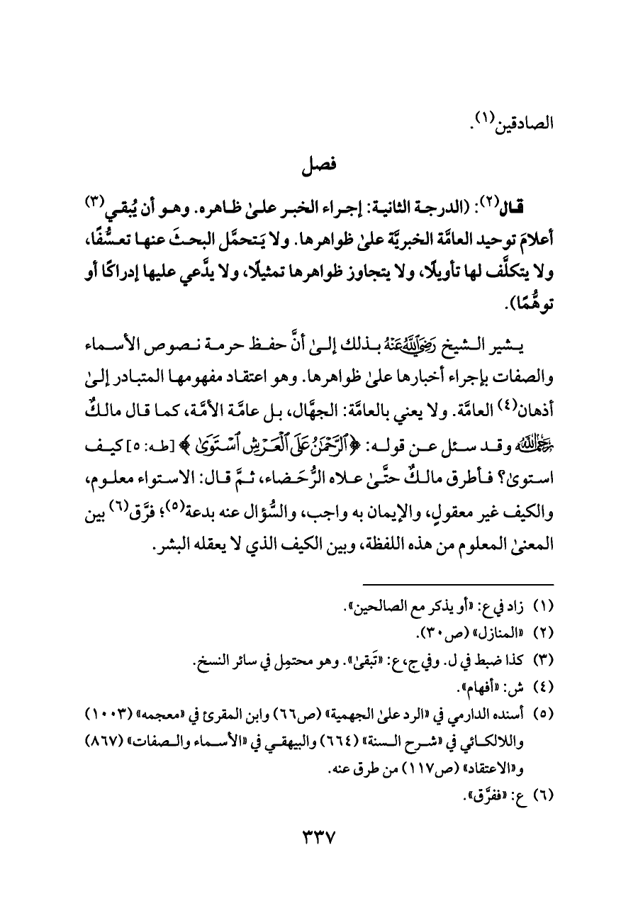 يشير الشيخ - رضي الله عنه - بذلك إلى أنَّ حفظ حرمة نصوص الأسماء والصفات بإجراء أخبارها على ظواهرها. وهو اعتقاد مفهومها المتبادر إلى أذهان (¬٤) العامَّة. ولا يعني بالعامَّة: الجهَّال، بل عامَّة الأمَّة، كما قال مالكٌ - رحمه الله - وقد سئل عن قوله: {الرَّحْمَنُ عَلَى الْعَرْشِ اسْتَوَى} [طه: ٥] كيف استوى؟ فأطرق مالكٌ حتَّى علاه الرُّحَضاء، ثمَّ قال: الاستواء معلوم، والكيف غير معقولٍ، والإيمان به واجب، والسُّؤال عنه بدعة (¬٥)؛ فرَّق (¬٦) بين المعنى المعلوم من هذه اللفظة، وبين الكيف الذي لا يعقله البشر.