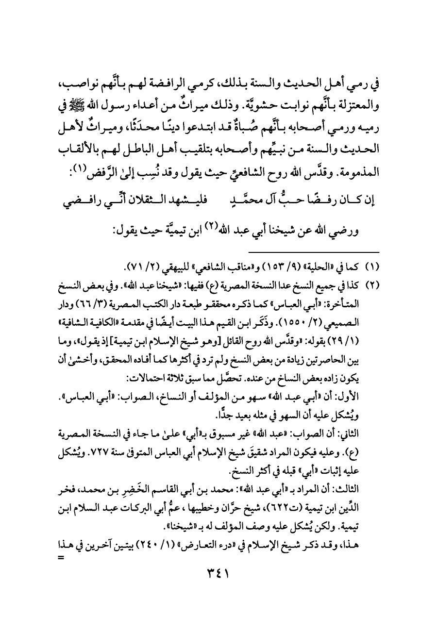 الثاني: أن الصواب: «عبد الله» غير مسبوق بـ «أبي» على ما جاء في النسخة المصرية (ع). وعليه فيكون المراد شقيقَ شيخ الإسلام أبي العباس المتوفى سنة ٧٢٧. ويُشكل عليه إثبات «أبي» قبله في أكثر النسخ.