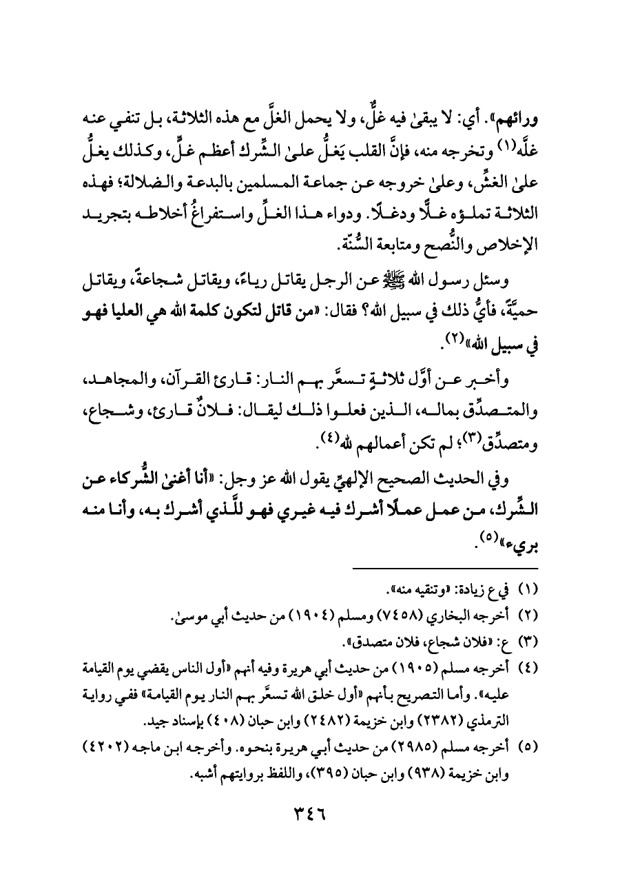 (¬٤) أخرجه مسلم (١٩٠٥) من حديث أبي هريرة وفيه أنهم «أول الناس يقضي يوم القيامة عليه». وأما التصريح بأنهم «أول خلق الله تسعَّر بهم النار يوم القيامة» ففي رواية الترمذي (٢٣٨٢) وابن خزيمة (٢٤٨٢) وابن حبان (٤٠٨) بإسناد جيد.
