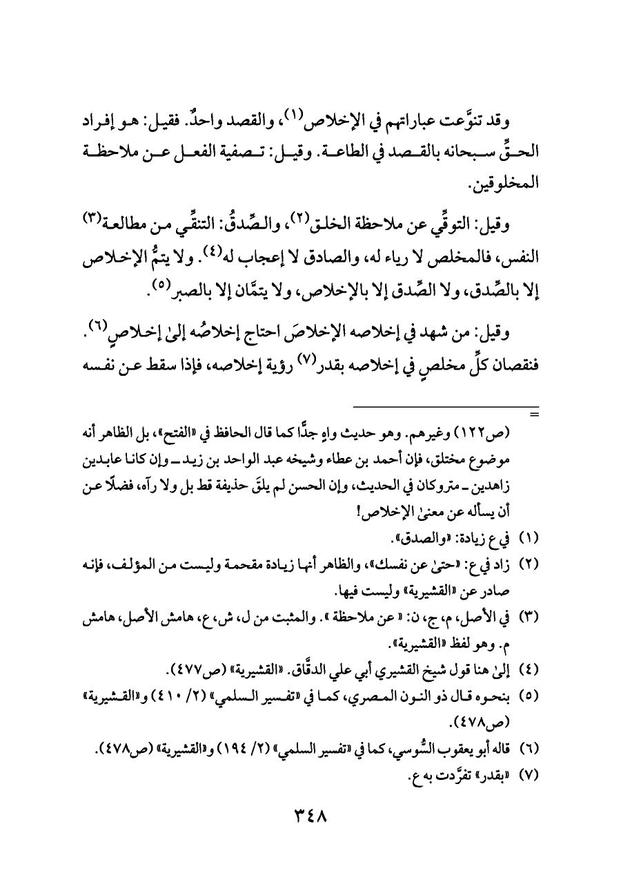 وقيل: التوقِّي عن ملاحظة الخلق (¬٢)، والصِّدقُ: التنقِّي من مطالعة (¬٣) النفس، فالمخلص لا رياء له، والصادق لا إعجاب له (¬٤). ولا يتمُّ الإخلاص إلا بالصِّدق، ولا الصِّدق إلا بالإخلاص، ولا يتمَّان إلا بالصبر (¬٥).