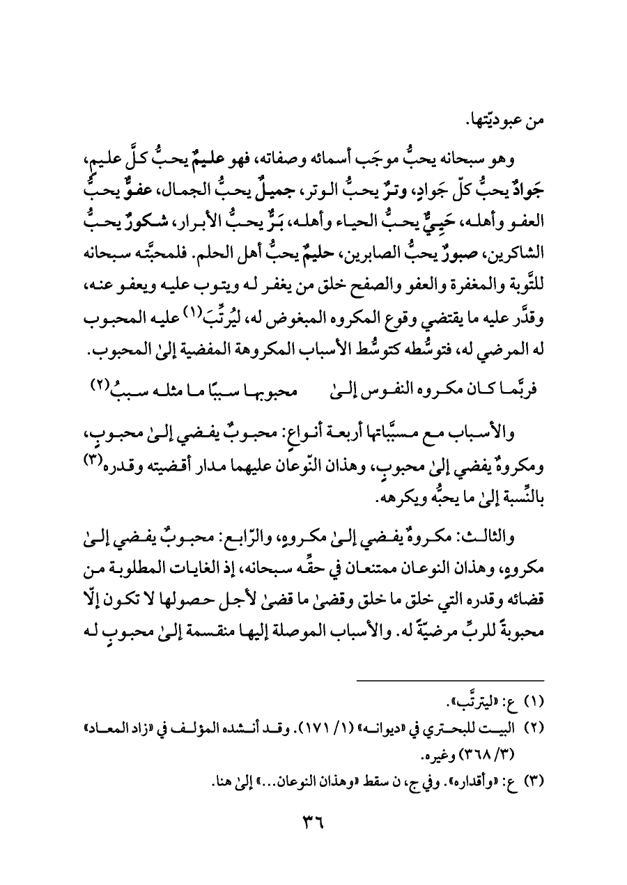 وهو سبحانه يحبُّ موجَب أسمائه وصفاته، فهو عليمٌ يحبُّ كلَّ عليمٍ، جَوادٌ يحبُّ كلّ جَوادٍ، وترٌ يحبُّ الوتر، جميلٌ يحبُّ الجمال، عفوٌّ يحبُّ العفو وأهله، حَيِيٌّ يحبُّ الحياء وأهله، بَرٌّ يحبُّ الأبرار، شكورٌ يحبُّ الشاكرين، صبورٌ يحبُّ الصابرين، حليمٌ يحبُّ أهل الحلم. فلمحبَّته سبحانه للتَّوبة والمغفرة والعفو والصفح خلق من يغفر له ويتوب عليه ويعفو عنه، وقدَّر عليه ما يقتضي وقوع المكروه المبغوض له، ليُرتِّبَ (¬١) عليه المحبوب له المرضي له، فتوسُّطه كتوسُّط الأسباب المكروهة المفضية إلى المحبوب.