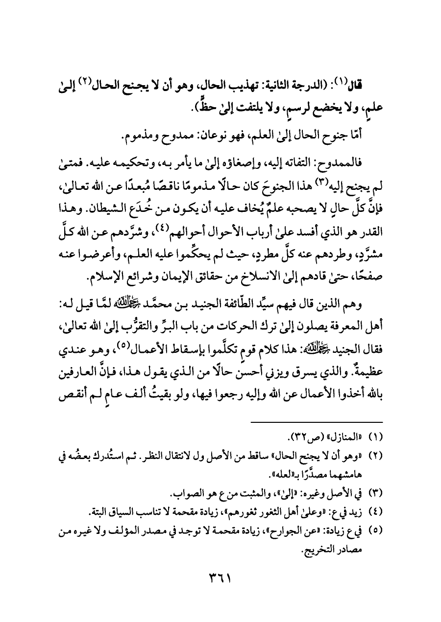 قال (¬١): (الدرجة الثانية: تهذيب الحال، وهو أن لا يجنح الحال (¬٢) إلى علمٍ، ولا يخضع لرسمٍ، ولا يلتفت إلى حظٍّ).