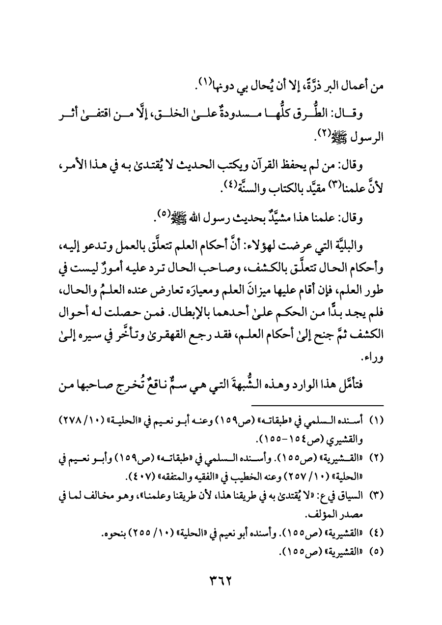 (¬٢) «القشيرية» (ص ١٥٥). وأسنده السلمي في «طبقاته» (ص ١٥٩) وأبو نعيم في «الحلية» (١٠/ ٢٥٧) وعنه الخطيب في «الفقيه والمتفقه» (٤٠٧).