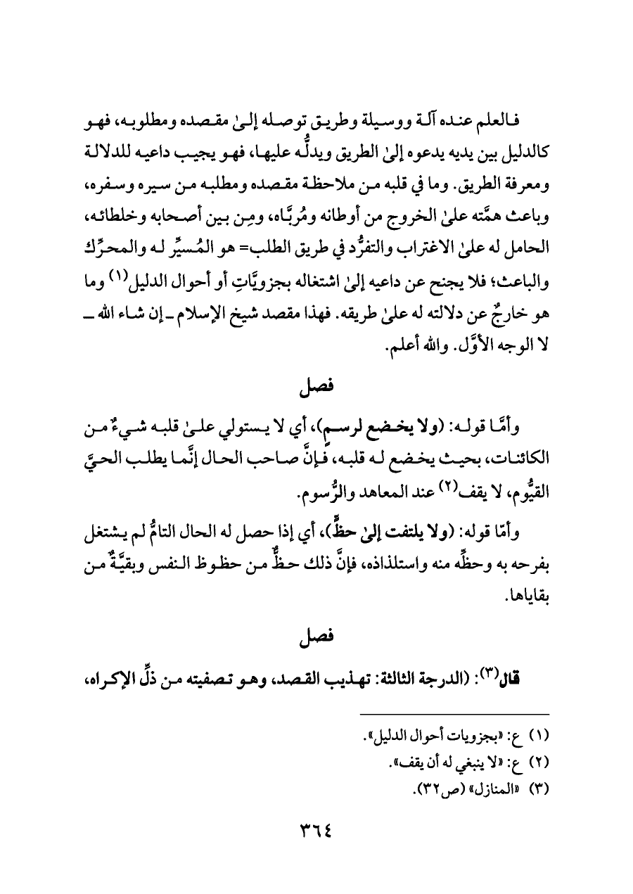 فالعلم عنده آلة ووسيلة وطريق توصله إلى مقصده ومطلوبه، فهو كالدليل بين يديه يدعوه إلى الطريق ويدلُّه عليها، فهو يجيب داعيه للدلالة ومعرفة الطريق. وما في قلبه من ملاحظة مقصده ومطلبه من سيره وسفره، وباعث همَّته على الخروج من أوطانه ومُربَّاه، ومِن بين أصحابه وخلطائه، الحامل له على الاغتراب والتفرُّد في طريق الطلب= هو المُسيِّر له والمحرِّك والباعث؛ فلا يجنح عن داعيه إلى اشتغاله بجزويَّاتِ أو أحوال الدليل (¬١) وما هو خارجٌ عن دلالته له على طريقه. فهذا مقصد شيخ الإسلام ــ إن شاء الله ــ لا الوجه الأوَّل. والله أعلم.