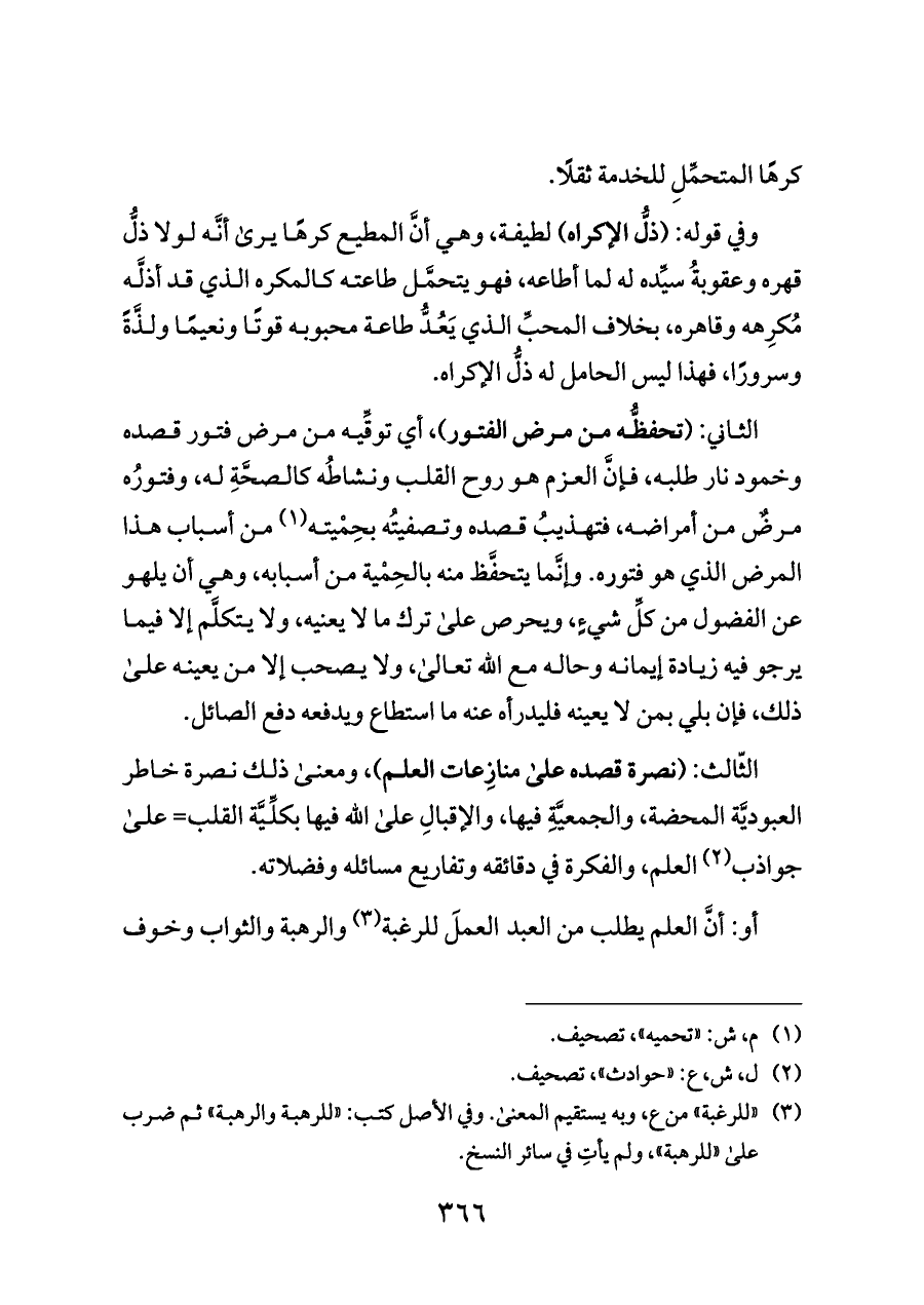 الثّالث: (نصرة قصده على منازِعات العلم)، ومعنى ذلك نصرة خاطر العبوديَّة المحضة، والجمعيَّةِ فيها، والإقبالِ على الله فيها بكلِّيَّة القلب= على جواذب (¬٢) العلم، والفكرة في دقائقه وتفاريع مسائله وفضلاته.