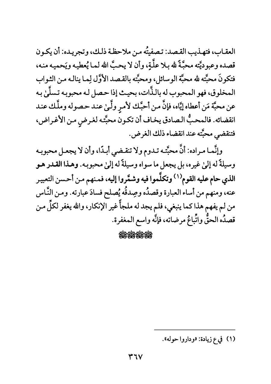 العقاب، فتهذيب القصد: تصفيتُه من ملاحظة ذلك، وتجريده: أن يكون قصده وعبوديَّته محبَّةً لله بلا علَّةٍ، وأن لا يحبَّ الله لما يُعطيه ويَحميه منه، فتكونَ محبَّته لله محبَّة الوسائل، ومحبَّته بالقصد الأوَّل لِما يناله من الثواب المخلوق، فهو المحبوب له بالذَّات، بحيث إذا حصل له محبوبه تسلَّى به عن محبَّة مَن أعطاه إيَّاه، فإنَّ من أحبَّك لأمرٍ ولَّى عند حصوله وملَّك عند انقضائه. فالمحبُّ الصادق يخاف أن تكون محبَّته لغرضٍ من الأغراض، فتنقضي محبَّته عند انقضاء ذلك الغرض.