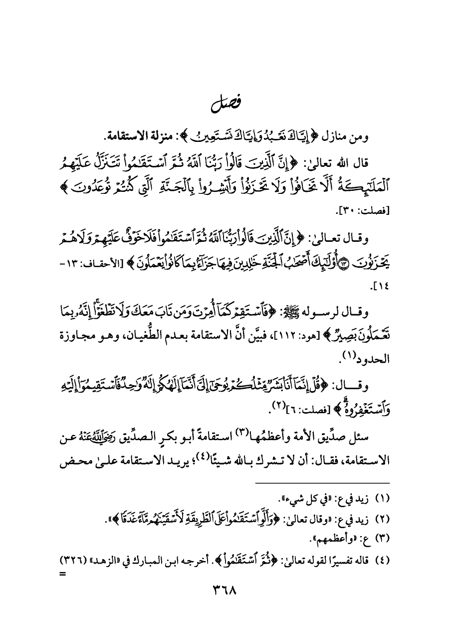 ومن منازل {إِيَّاكَ نَعْبُدُ وَإِيَّاكَ نَسْتَعِينُ}: منزلة الاستقامة.