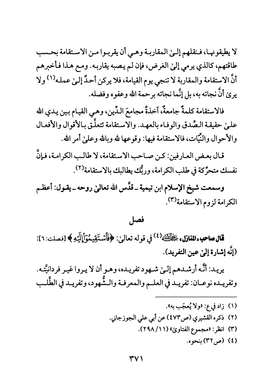 قال صاحب «المنازل» - رحمه الله - (¬٤) في قوله تعالى: {فَاسْتَقِيمُوا إِلَيْهِ} [فصلت: ٦]: (إنَّه إشارة إلى عين التفريد).
