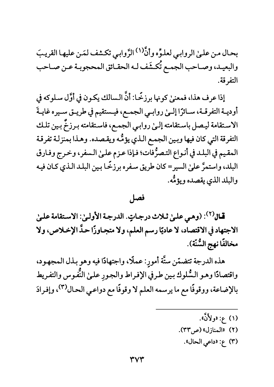 إذا عرف هذا، فمعنى كونها برزخًا: أنَّ السالك يكون في أوَّل سلوكه في أودية التفرقة، سائرًا إلى روابي الجمع، فيستقيم في طريق سيره غايةَ الاستقامة ليصل باستقامته إلى روابي الجمع، فاستقامته برزخٌ بين تلك التفرقة التي كان فيها وبين الجمع الذي يؤمُّه ويقصده. وهذا بمنزلة تفرقة المقيم في البلد في أنواع التصرُّفات؛ فإذا عزم على السفر، وخرج وفارق البلد، واستمرَّ على السير= كان طريق سفره برزخًا بين البلد الذي كان فيه والبلد الذي يقصده ويؤمُّه.