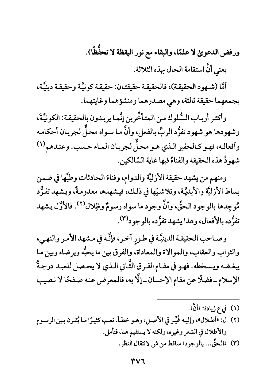 وأكثر أرباب السُّلوك من المتأخِّرين إنَّما يريدون بالحقيقة: الكونيَّةَ، وشهودها هو شهود تفرُّد الربِّ بالفعل، وأنَّ ما سواه محلٌّ لجريان أحكامه وأفعاله، فهو كالحفير الذي هو محلٌّ لجريان الماء حسب. وعندهم (¬١) شهودُ هذه الحقيقة والفناءُ فيها غاية السّالكين.