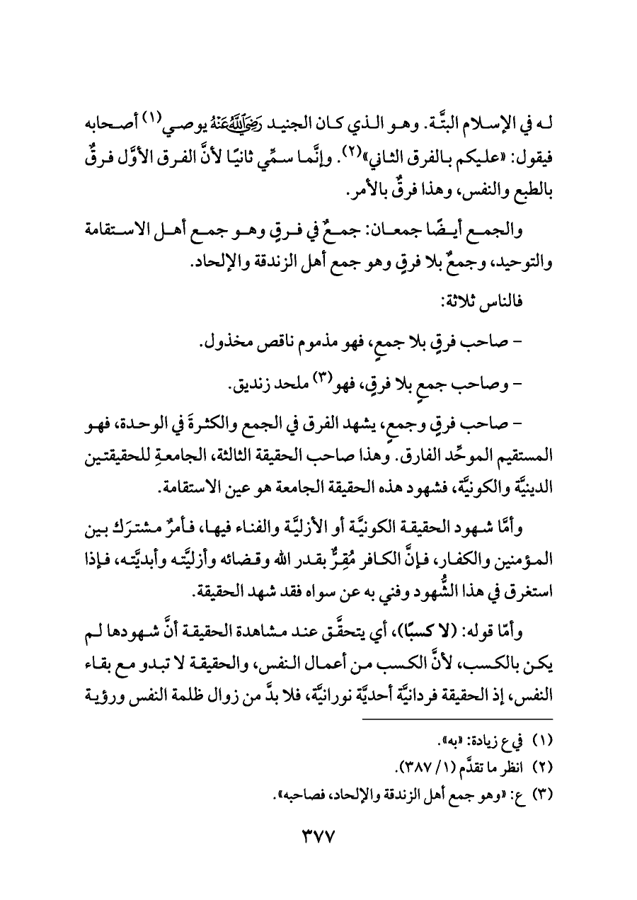 والجمع أيضًا جمعان: جمعٌ في فرقٍ وهو جمع أهل الاستقامة والتوحيد، وجمعٌ بلا فرقٍ وهو جمع أهل الزندقة والإلحاد.