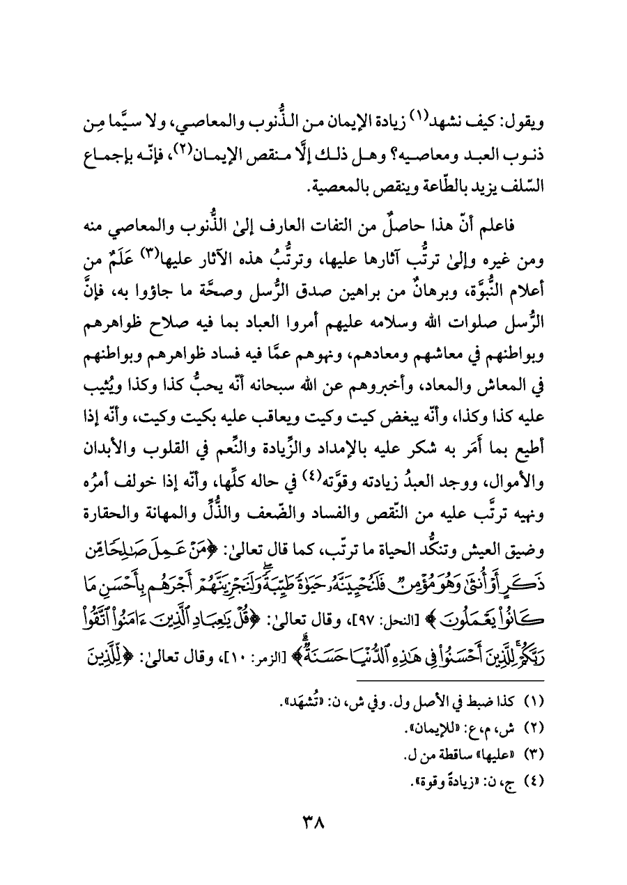 فاعلم أنّ هذا حاصلٌ من التفات العارف إلى الذُّنوب والمعاصي منه ومن غيره وإلى ترتُّب آثارها عليها، وترتُّبُ هذه الآثار عليها (¬٣) عَلَمٌ من أعلام النُّبوَّة، وبرهانٌ من براهين صدق الرُّسل وصحَّة ما جاؤوا به، فإنَّ الرُّسل صلوات الله وسلامه عليهم أمروا العباد بما فيه صلاح ظواهرهم وبواطنهم في معاشهم ومعادهم، ونهوهم عمَّا فيه فساد ظواهرهم وبواطنهم في المعاش والمعاد، وأخبروهم عن الله سبحانه أنّه يحبُّ كذا وكذا ويُثيب عليه كذا وكذا، وأنّه يبغض كيت وكيت ويعاقب عليه بكيت وكيت، وأنّه إذا أطيع بما أَمَر به شكر عليه بالإمداد والزِّيادة والنِّعم في القلوب والأبدان والأموال، ووجد العبدُ زيادته وقوَّته (¬٤) في حاله كلِّها، وأنّه إذا خولف أمرُه ونهيه ترتَّب عليه من النّقص والفساد والضّعف والذُّلِّ والمهانة والحقارة وضيق العيش وتنكُّد الحياة ما ترتّب، كما قال تعالى: {يَعْمَلُونَ (٩٦) مَنْ عَمِلَ صَالِحًا مِنْ ذَكَرٍ أَوْ أُنْثَى وَهُوَ مُؤْمِنٌ فَلَنُحْيِيَنَّهُ حَيَاةً طَيِّبَةً وَلَنَجْزِيَنَّهُمْ أَجْرَهُمْ بِأَحْسَنِ مَا} [النحل: ٩٧]، وقال تعالى: {(٩) قُلْ يَاعِبَادِ الَّذِينَ آمَنُوا اتَّقُوا رَبَّكُمْ لِلَّذِينَ أَحْسَنُوا فِي هَذِهِ الدُّنْيَا حَسَنَةٌ} [الزمر: ١٠]، وقال تعالى: {لِلَّذِينَ