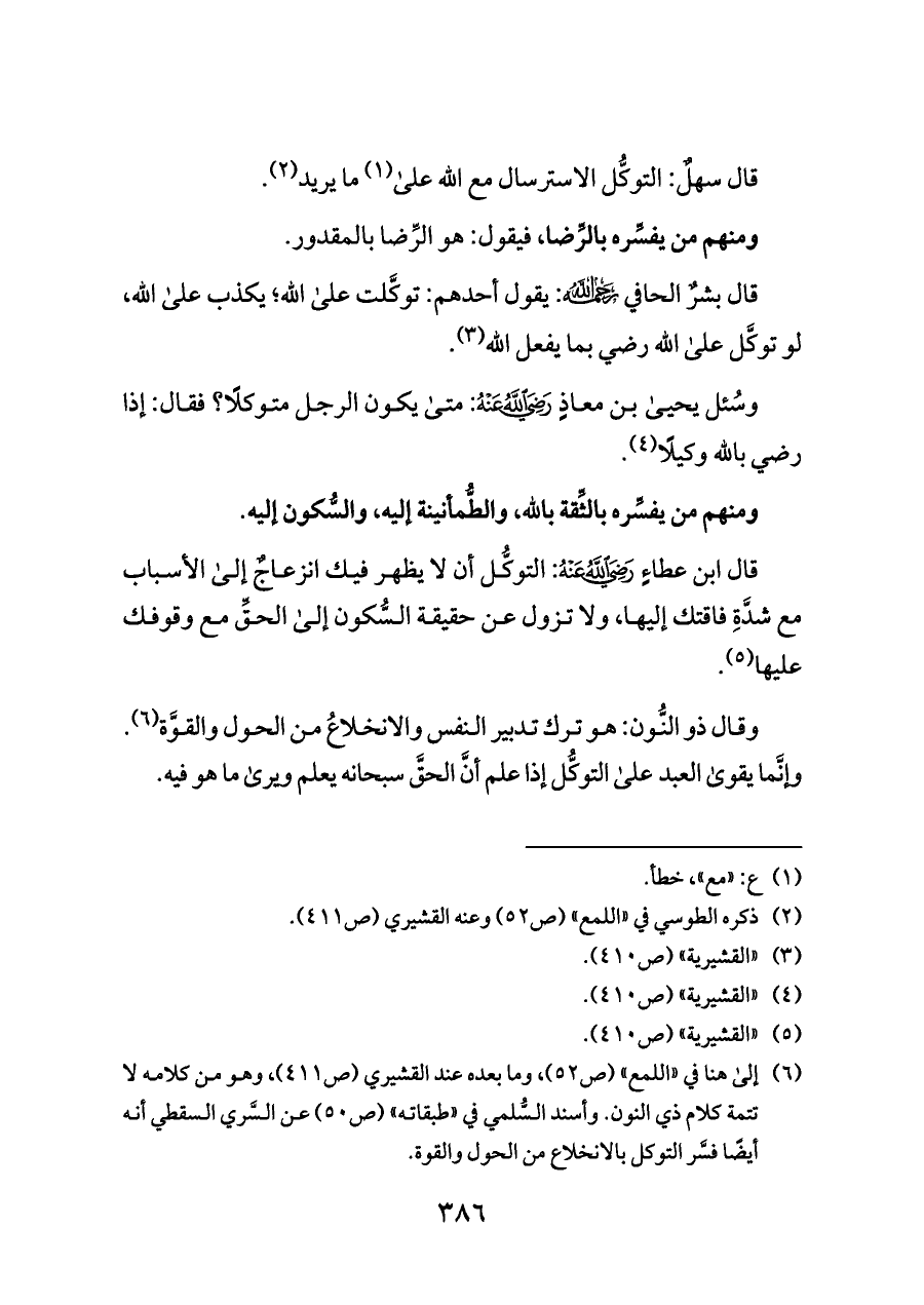 (¬٦) إلى هنا في «اللمع» (ص ٥٢)، وما بعده عند القشيري (ص ٤١١)، وهو من كلامه لا تتمة كلام ذي النون. وأسند السُّلمي في «طبقاته» (ص ٥٠) عن السَّري السقطي أنه أيضًا فسَّر التوكل بالانخلاع من الحول والقوة.