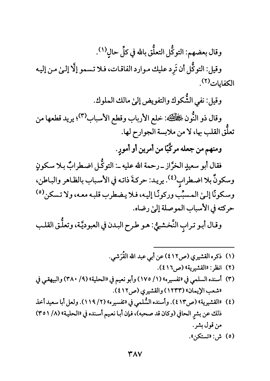 (¬٤) «القشيرية» (ص ٤١٣). وأسنده السُّلمي في «تفسيره» (٢/ ١١٩). ولعل أبا سعيد أخذ ذلك عن بشرٍ الحافي (وكان قد صحبه)، فإن أبا نعيم أسنده في «الحلية» (٨/ ٣٥١) من قول بشر.