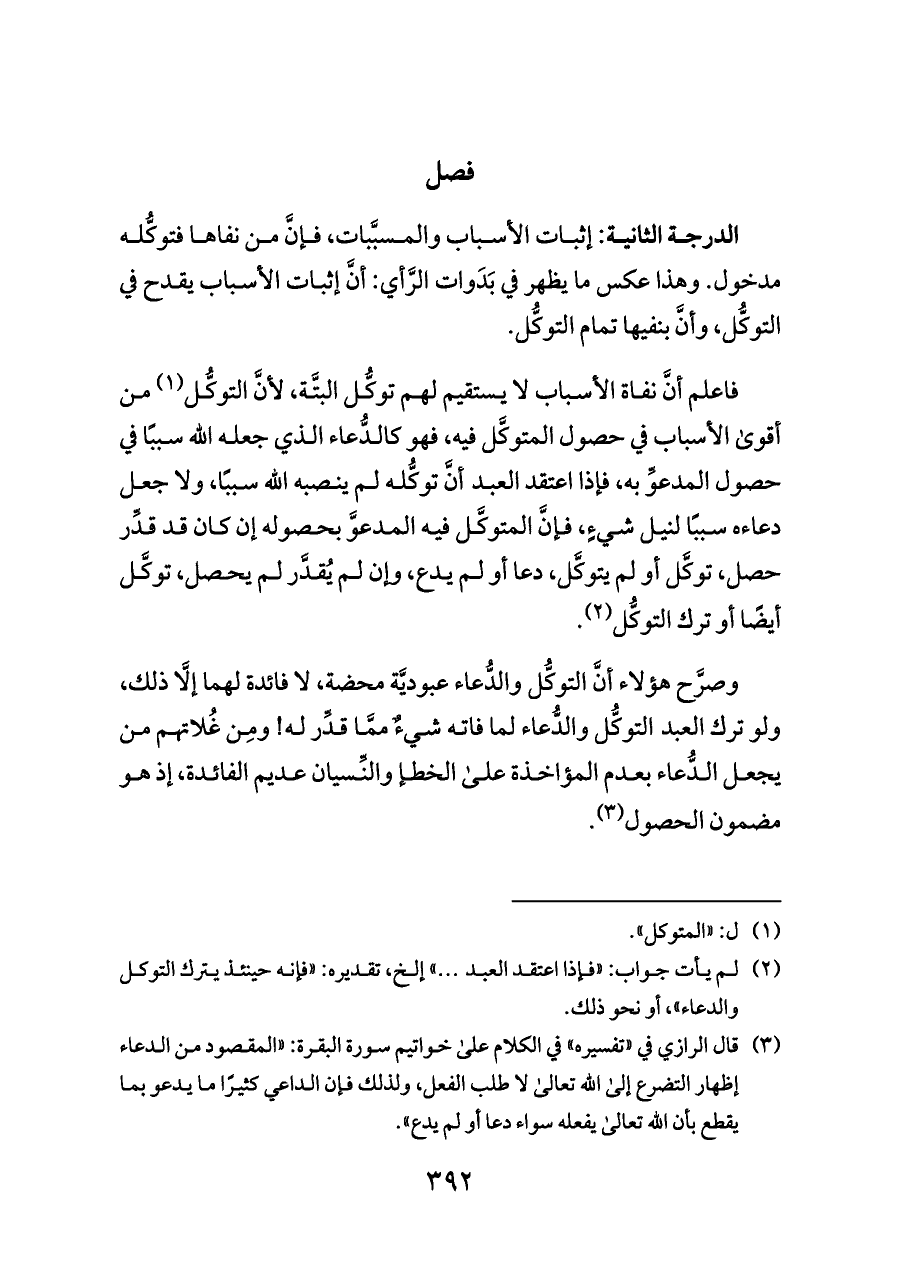 (¬٢) لم يأت جواب: «فإذا اعتقد العبد ... » إلخ، تقديره: «فإنه حينئذ يترك التوكل والدعاء»، أو نحو ذلك.