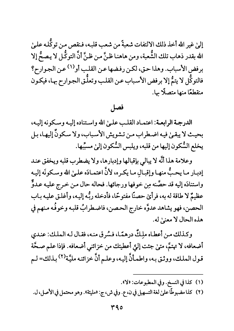 الدرجة الرابعة: اعتماد القلب على الله واستناده إليه وسكونه إليه، بحيث لا يبقى فيه اضطراب من تشويش الأسباب، ولا سكونٌ إليها، بل يخلع السُّكون إليها من قلبه، ويلبس السُّكون إلى مسبِّبها.