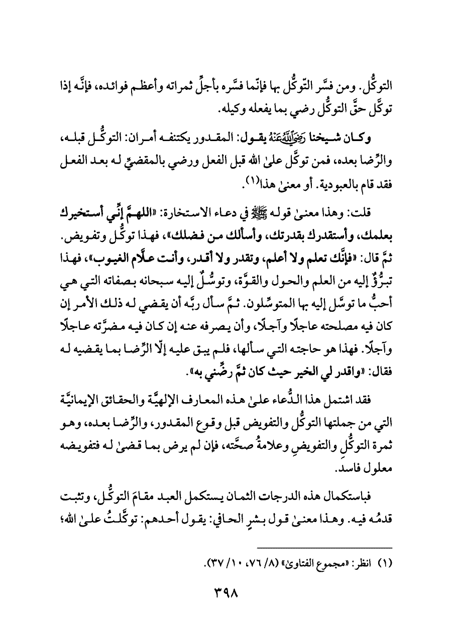 قلت: وهذا معنى قوله - صلى الله عليه وسلم - في دعاء الاستخارة: «اللهمَّ إنِّي أستخيرك بعلمك، وأستقدرك بقدرتك، وأسألك من فضلك»، فهذا توكُّل وتفويض. ثمَّ قال: «فإنَّك تعلم ولا أعلم، وتقدر ولا أقدر، وأنت علَّام الغيوب»، فهذا تبرُّؤٌ إليه من العلم والحول والقوَّة، وتوسُّلٌ إليه سبحانه بصفاته التي هي أحبُّ ما توسَّل إليه بها المتوسِّلون. ثمَّ سأل ربَّه أن يقضي له ذلك الأمر إن كان فيه مصلحته عاجلًا وآجلًا، وأن يصرفه عنه إن كان فيه مضرَّته عاجلًا وآجلًا. فهذا هو حاجته التي سألها، فلم يبق عليه إلّا الرِّضا بما يقضيه له فقال: «واقدر لي الخير حيث كان ثمَّ رضِّني به».
