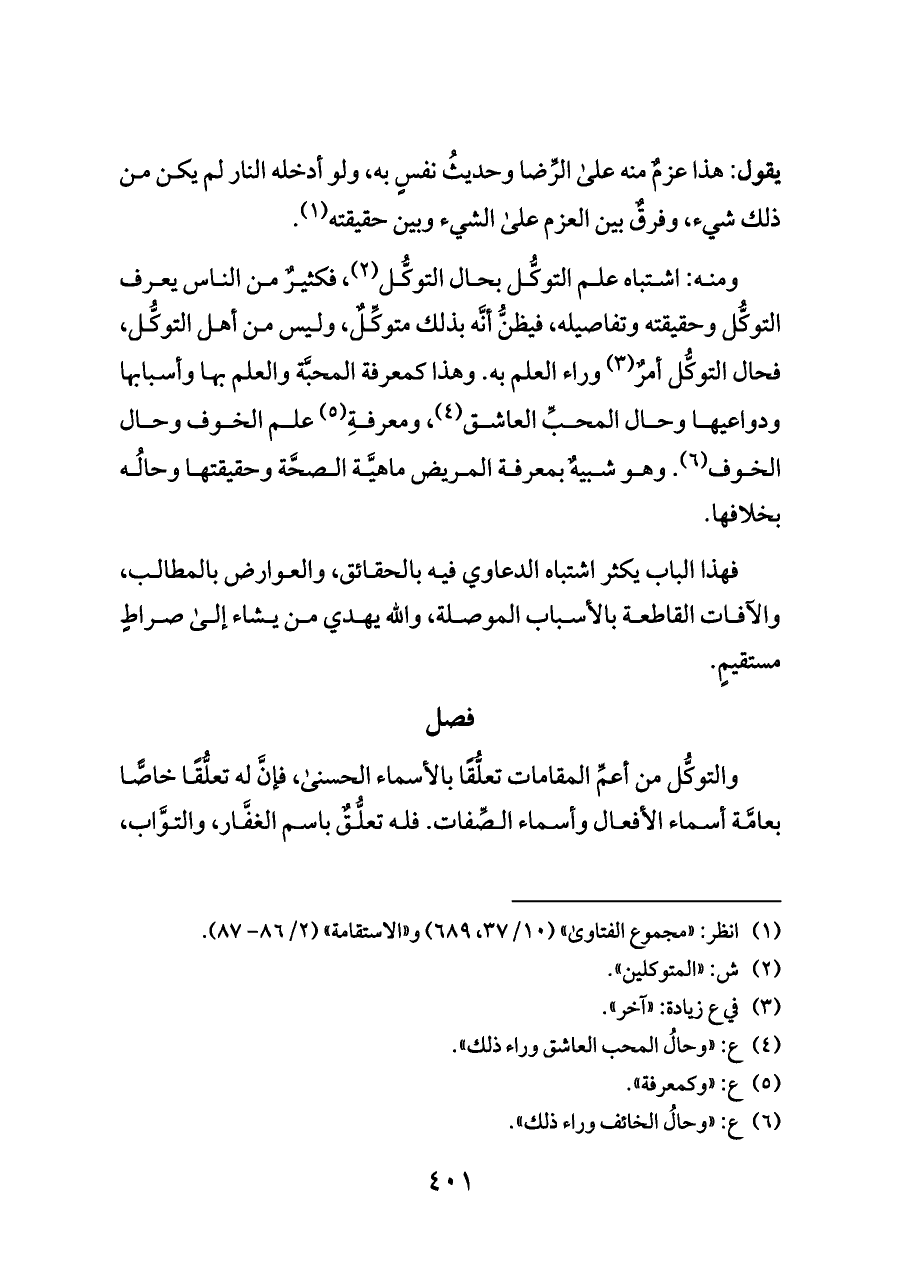 ومنه: اشتباه علم التوكُّل بحال التوكُّل (¬٢)، فكثيرٌ من الناس يعرف التوكُّل وحقيقته وتفاصيله، فيظنُّ أنَّه بذلك متوكِّلٌ، وليس من أهل التوكُّل، فحال التوكُّل أمرٌ (¬٣) وراء العلم به. وهذا كمعرفة المحبَّة والعلم بها وأسبابها ودواعيها وحال المحبِّ العاشق (¬٤)، ومعرفةِ (¬٥) علم الخوف وحال الخوف (¬٦). وهو شبيهٌ بمعرفة المريض ماهيَّة الصحَّة وحقيقتها وحالُه بخلافها.