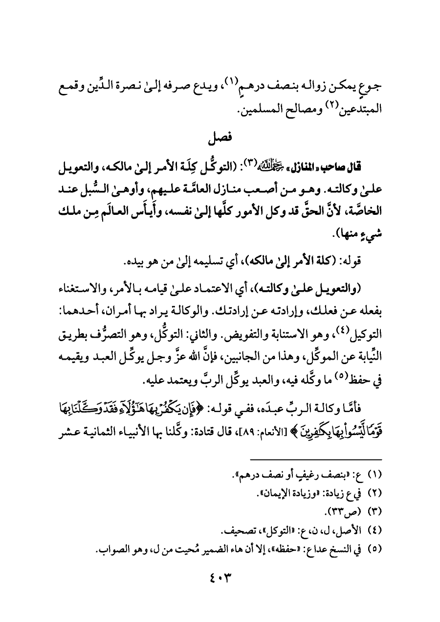 قال صاحب «المنازل» - رحمه الله - (¬٣): (التوكُّل كِلَة الأمر إلى مالكه، والتعويل على وكالته. وهو من أصعب منازل العامَّة عليهم، وأوهى السُّبل عند الخاصَّة، لأنَّ الحقَّ قد وكل الأمور كلَّها إلى نفسه، وأَيأَس العالَم مِن ملك شيءٍ منها).