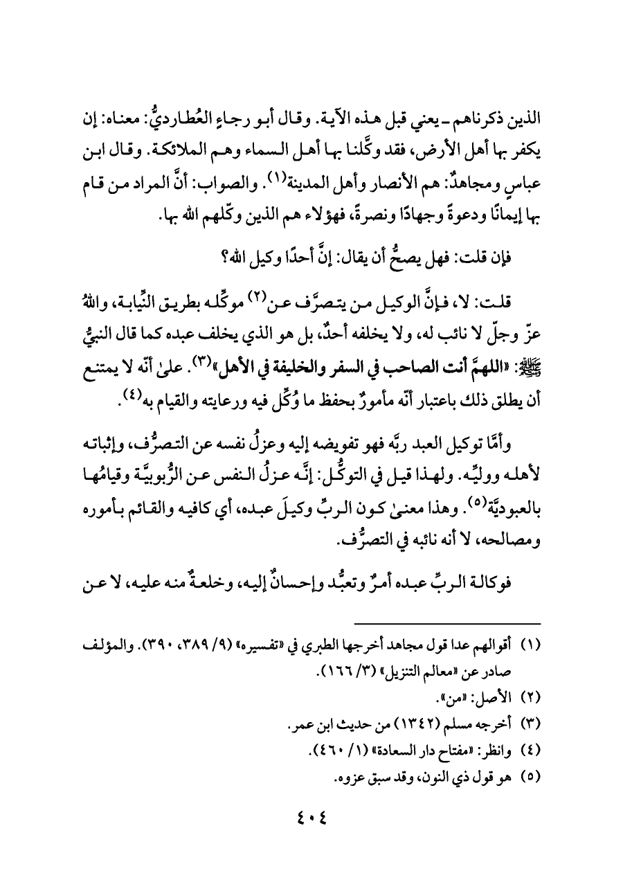 قلت: لا، فإنَّ الوكيل من يتصرَّف عن (¬٢) موكِّله بطريق النِّيابة، واللهُ عزّ وجلّ لا نائب له، ولا يخلفه أحدٌ، بل هو الذي يخلف عبده كما قال النبيُّ - صلى الله عليه وسلم -: «اللهمَّ أنت الصاحب في السفر والخليفة في الأهل» (¬٣). على أنّه لا يمتنع أن يطلق ذلك باعتبار أنّه مأمورٌ بحفظ ما وُكِّل فيه ورعايته والقيام به (¬٤).