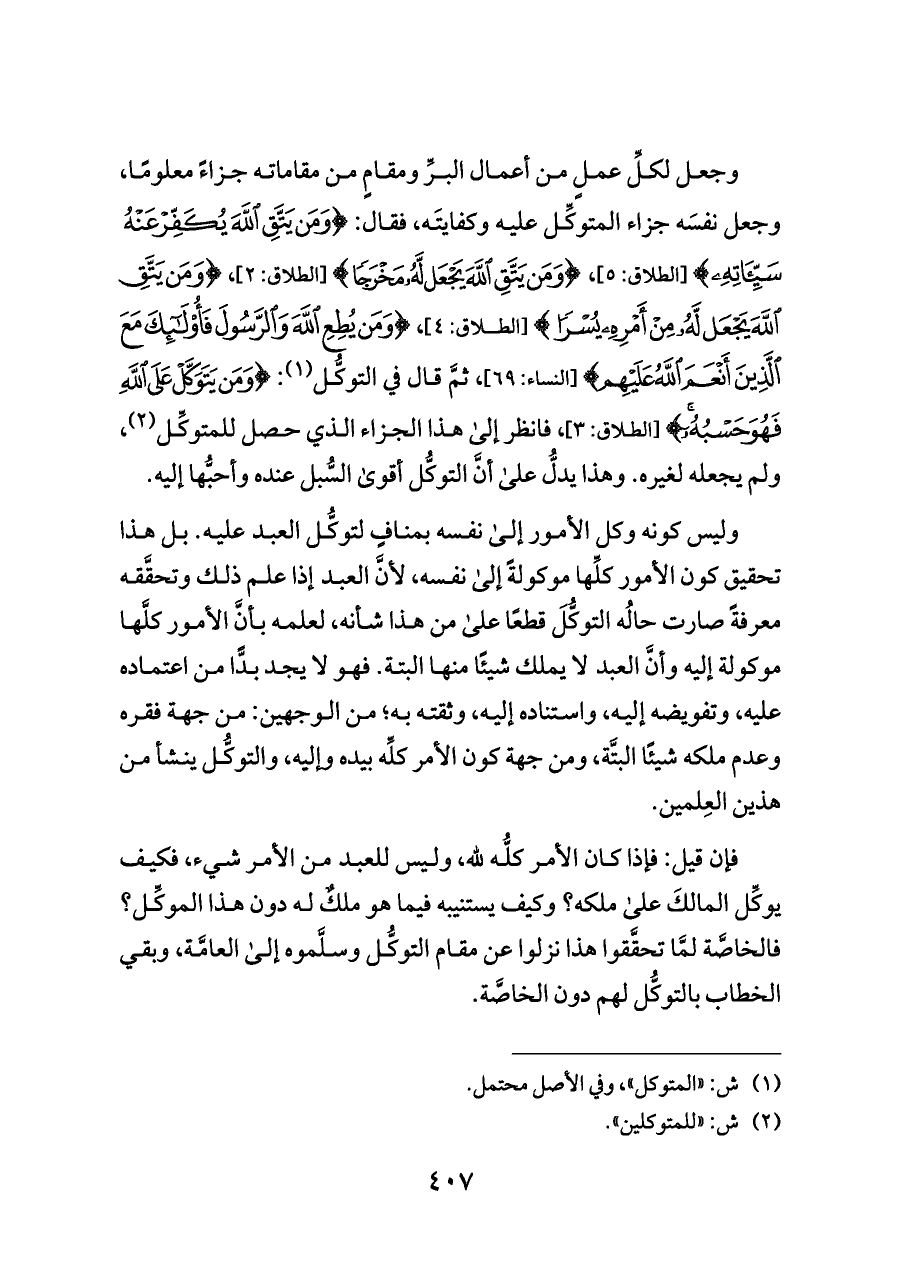 فإن قيل: فإذا كان الأمر كلُّه لله، وليس للعبد من الأمر شيء، فكيف يوكِّل المالكَ على ملكه؟ وكيف يستنيبه فيما هو ملكٌ له دون هذا الموكِّل؟ فالخاصَّة لمَّا تحقَّقوا هذا نزلوا عن مقام التوكُّل وسلَّموه إلى العامَّة، وبقي الخطاب بالتوكُّل لهم دون الخاصَّة.