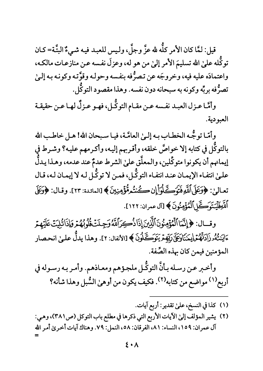 (¬٢) يشير المؤلف إلى الآيات الأربع التي ذكرها في مطلع باب التوكل (ص ٣٨١)، وهي: آل عمران: ١٥٩، النساء: ٨١، الفرقان: ٥٨، النمل: ٧٩. وهناك آيات أخرى أمر الله فيها رسوله بالتوكل، كقوله تعالى في خاتمة هود: {وَلِلَّهِ غَيْبُ السَّمَاوَاتِ وَالْأَرْضِ وَإِلَيْهِ يُرْجَعُ الْأَمْرُ كُلُّهُ فَاعْبُدْهُ وَتَوَكَّلْ عَلَيْهِ}، وقوله في مطلع الأحزاب: {وَتَوَكَّلْ عَلَى اللَّهِ وَكَفَى بِاللَّهِ وَكِيلًا}، وغيرهما.