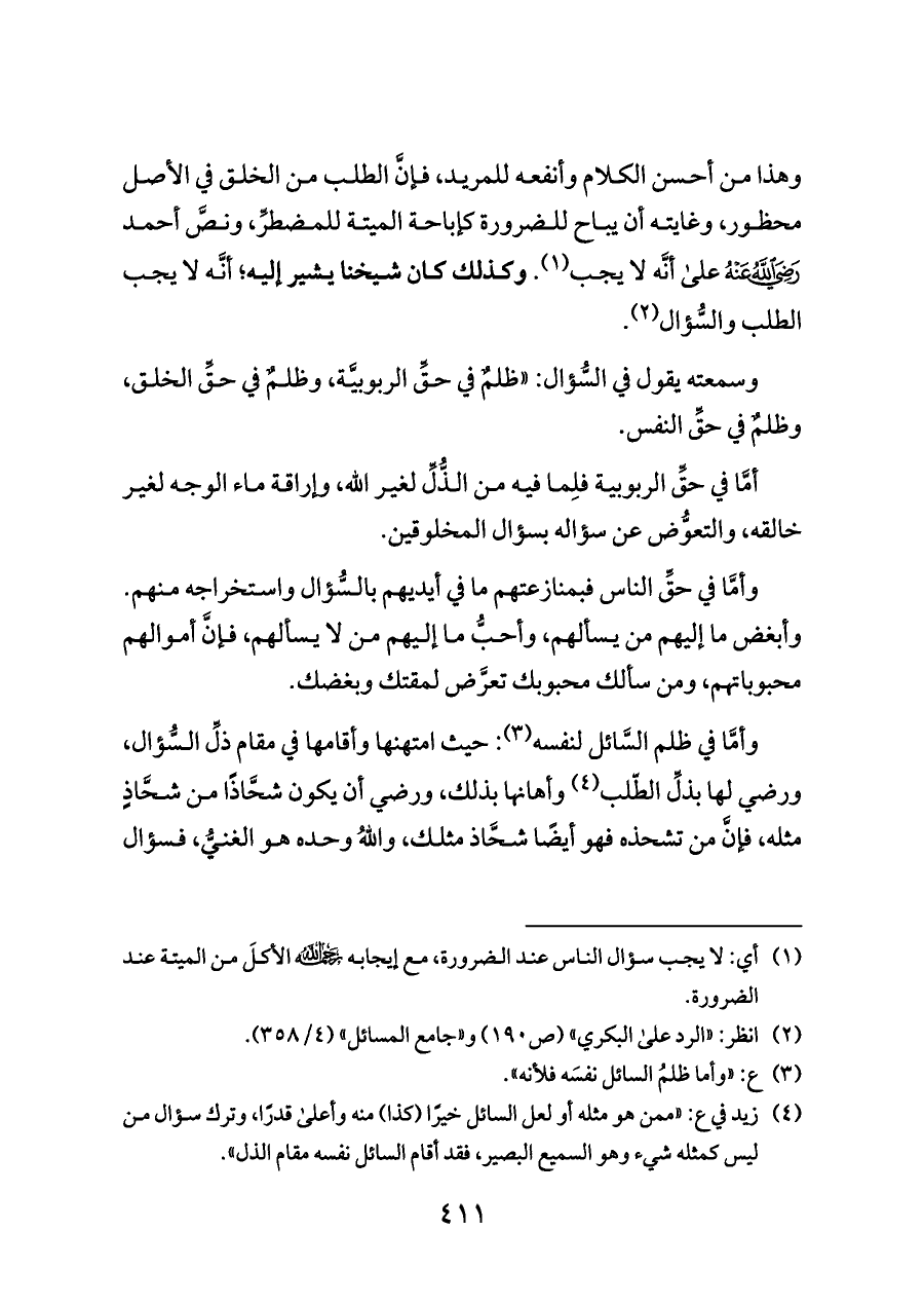 وهذا من أحسن الكلام وأنفعه للمريد، فإنَّ الطلب من الخلق في الأصل محظور، وغايته أن يباح للضرورة كإباحة الميتة للمضطرِّ، ونصَّ أحمد - رضي الله عنه - على أنَّه لا يجب (¬١). وكذلك كان شيخنا يشير إليه؛ أنَّه لا يجب الطلب والسُّؤال (¬٢).