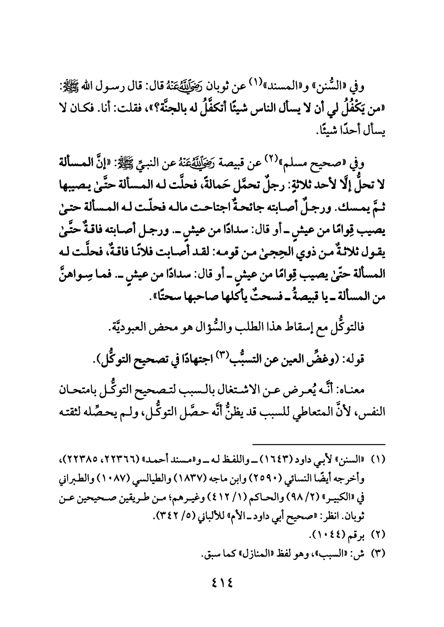 وفي «السُّنن» و «المسند» (¬١) عن ثوبان - رضي الله عنه - قال: قال رسول الله - صلى الله عليه وسلم -: «من يَكْفُلُ لي أن لا يسأل الناس شيئًا أتكفَّلُ له بالجنَّة؟»، فقلت: أنا. فكان لا يسأل أحدًا شيئًا.