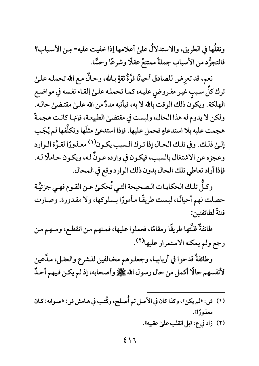 نعم، قد تعرِض للصادق أحيانًا قوَّةُ ثقةٍ بالله، وحالٌ مع الله تحمله على ترك كلِّ سببٍ غير مفروضٍ عليه، كما تحمله على إلقاء نفسه في مواضع الهلكة. ويكون ذلك الوقت بالله لا به، فيأتيه مددٌ من الله على مقتضى حاله. ولكن لا يدوم له هذا الحال، وليست في مقتضى الطبيعة، فإنها كانت هجمةً هجمت عليه بلا استدعاءٍ فحمل عليها. فإذا استدعى مثلَها وتكلَّفها لم يُجَب إلى ذلك. وفي تلك الحال إذا ترك السبب يكون (¬١) معذورًا لقوَّة الوارد وعجزه عن الاشتغال بالسبب، فيكون في وارده عونٌ له، ويكون حاملًا له. فإذا أراد تعاطي تلك الحال بدون ذلك الوارد وقع في المحال.