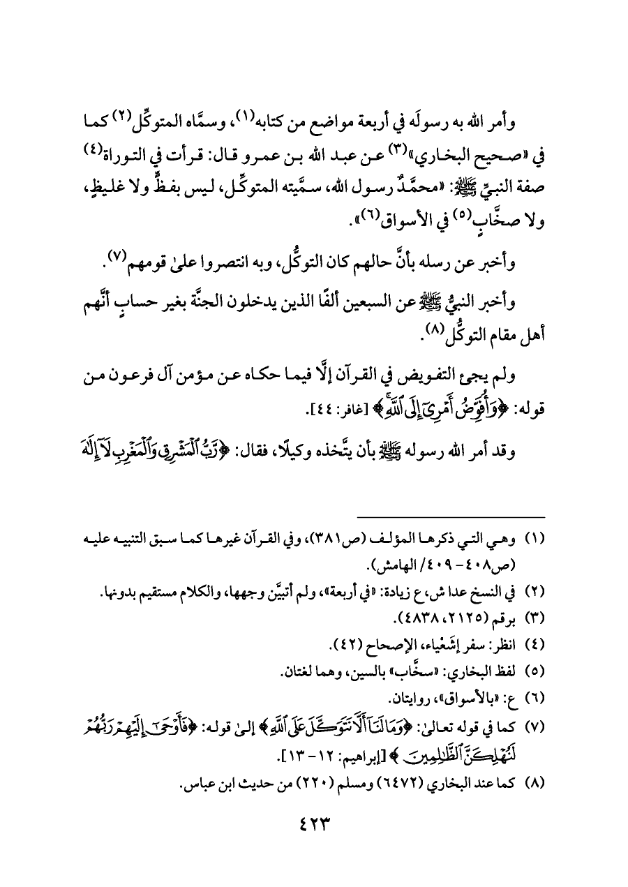 وأمر الله به رسولَه في أربعة مواضع من كتابه (¬١)، وسمَّاه المتوكِّل (¬٢) كما في «صحيح البخاري» (¬٣) عن عبد الله بن عمرو قال: قرأت في التوراة (¬٤) صفة النبيِّ - صلى الله عليه وسلم -: «محمَّدٌ رسول الله، سمَّيته المتوكِّل، ليس بفظٍّ ولا غليظٍ، ولا صخَّابٍ (¬٥) في الأسواق (¬٦)».