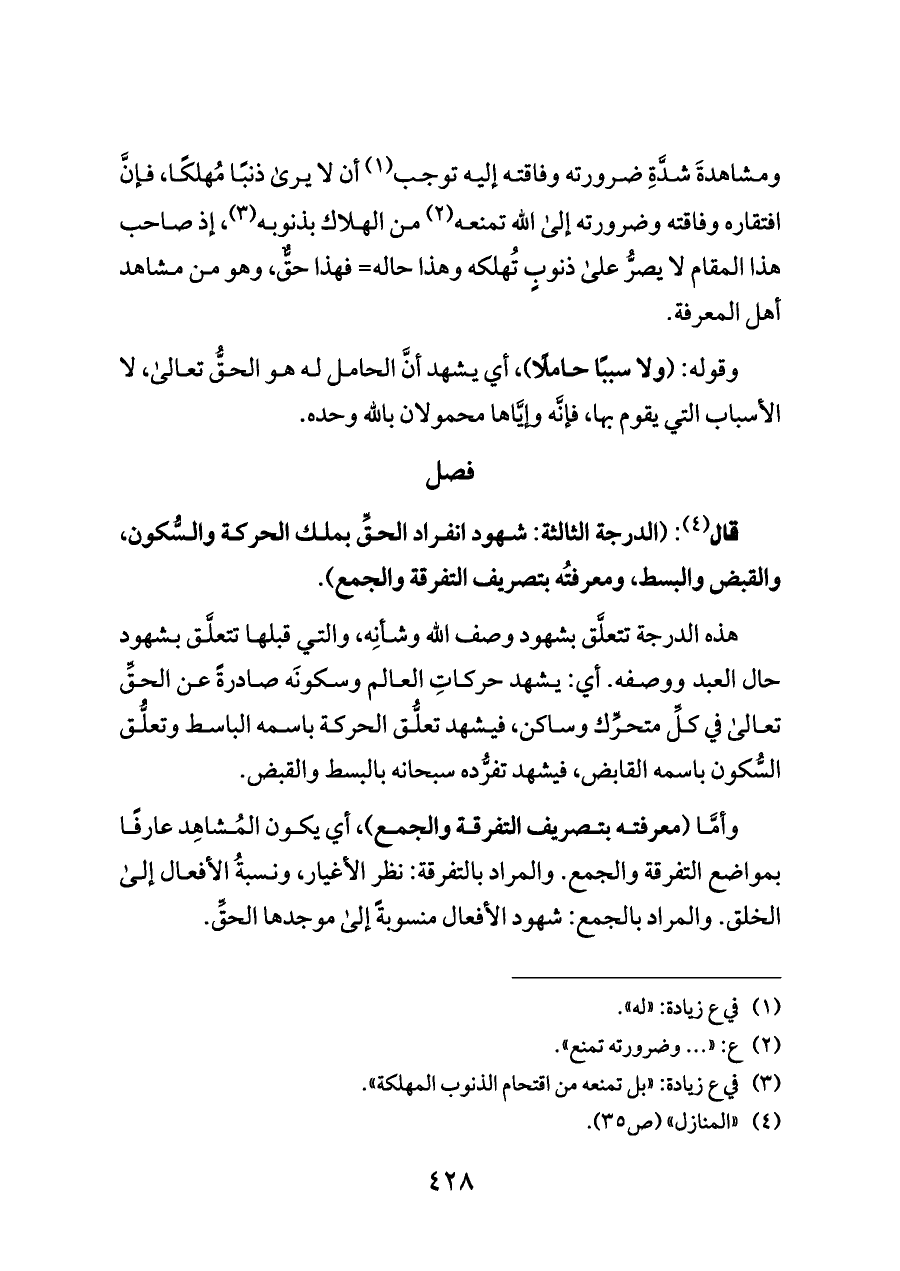 قال (¬٤): (الدرجة الثالثة: شهود انفراد الحقِّ بملك الحركة والسُّكون، والقبض والبسط، ومعرفتُه بتصريف التفرقة والجمع).