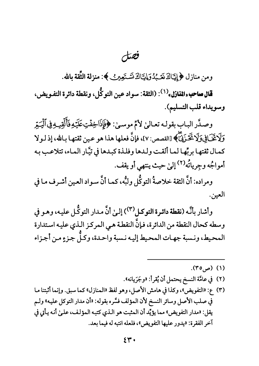 (¬٣) ع: «التفويض» , وكذا في هامش الأصل, وهو لفظ «المنازل» كما سبق. وإنما أثبتنا ما في صلب الأصل وسائر النسخ لأن المؤلف فسَّره بقوله: «أن مدار التوكل عليه» ولم يقل: «مدار التفويض» مما يؤيِّد أن المثبت هو الذي كتبه المؤلف، على أنه يأتي في آخر الفقرة: «يدور عليها التفويض» , فلعله انتبه له فيما بعد.