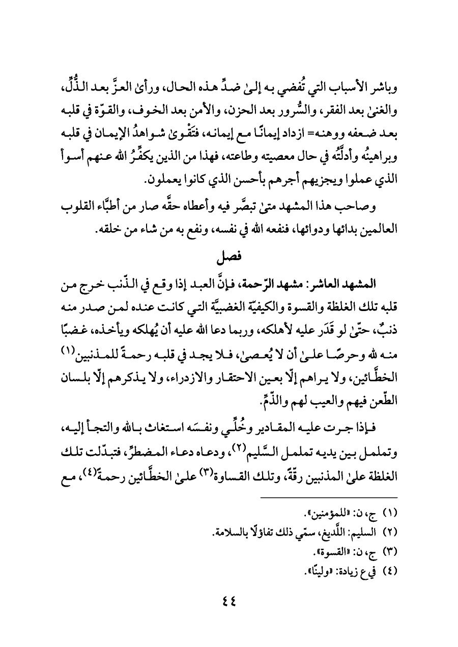 المشهد العاشر: مشهد الرّحمة، فإنَّ العبد إذا وقع في الذّنب خرج من قلبه تلك الغلظة والقسوة والكيفيّة الغضبيَّة التي كانت عنده لمن صدر منه ذنبٌ، حتّى لو قَدَر عليه لأهلكه، وربما دعا الله عليه أن يُهلكه ويأخذه، غضبًا منه لله وحرصًا على أن لا يُعصى، فلا يجد في قلبه رحمةً للمذنبين (¬١) الخطَّائين، ولا يراهم إلّا بعين الاحتقار والازدراء، ولا يذكرهم إلّا بلسان الطّعن فيهم والعيب لهم والذّمِّ.