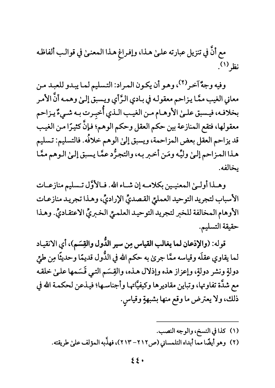وهذا أولى المعنيين بكلامه إن شاء الله. فالأوَّل تسليم منازعات الأسباب لتجريد التوحيد العمليِّ القصديِّ الإراديِّ، وهذا تجريد منازعات الأوهام المخالفة للخبر لتجريد التوحيد العلميِّ الخبريِّ الاعتقاديِّ. وهذا حقيقة التسليم.