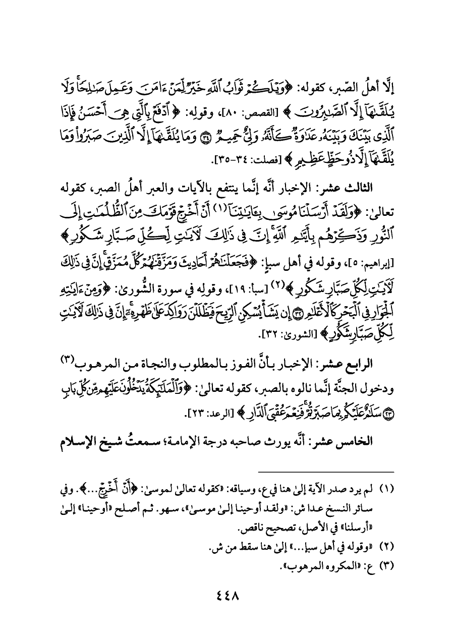 الثالث عشر: الإخبار أنَّه إنَّما ينتفع بالآيات والعبر أهلُ الصبر، كقوله تعالى: {وَلَقَدْ أَرْسَلْنَا مُوسَى بِآيَاتِنَا (¬١) أَنْ أَخْرِجْ قَوْمَكَ مِنَ الظُّلُمَاتِ إِلَى النُّورِ وَذَكِّرْهُمْ بِأَيَّامِ اللَّهِ إِنَّ فِي ذَلِكَ لَآيَاتٍ لِكُلِّ صَبَّارٍ شَكُورٍ} [إبراهيم: ٥]، وقوله في أهل سبإٍ: {فَجَعَلْنَاهُمْ أَحَادِيثَ وَمَزَّقْنَاهُمْ كُلَّ مُمَزَّقٍ إِنَّ فِي ذَلِكَ لَآيَاتٍ لِكُلِّ صَبَّارٍ شَكُورٍ} (¬٢) [سبأ: ١٩]، وقولِه في سورة الشُّورى: {وَمِنْ آيَاتِهِ الْجَوَارِ فِي الْبَحْرِ كَالْأَعْلَامِ (٣٢) إِنْ يَشَأْ يُسْكِنِ الرِّيحَ فَيَظْلَلْنَ رَوَاكِدَ عَلَى ظَهْرِهِ إِنَّ فِي ذَلِكَ لَآيَاتٍ لِكُلِّ صَبَّارٍ شَكُورٍ} [الشورى: ٣٢].