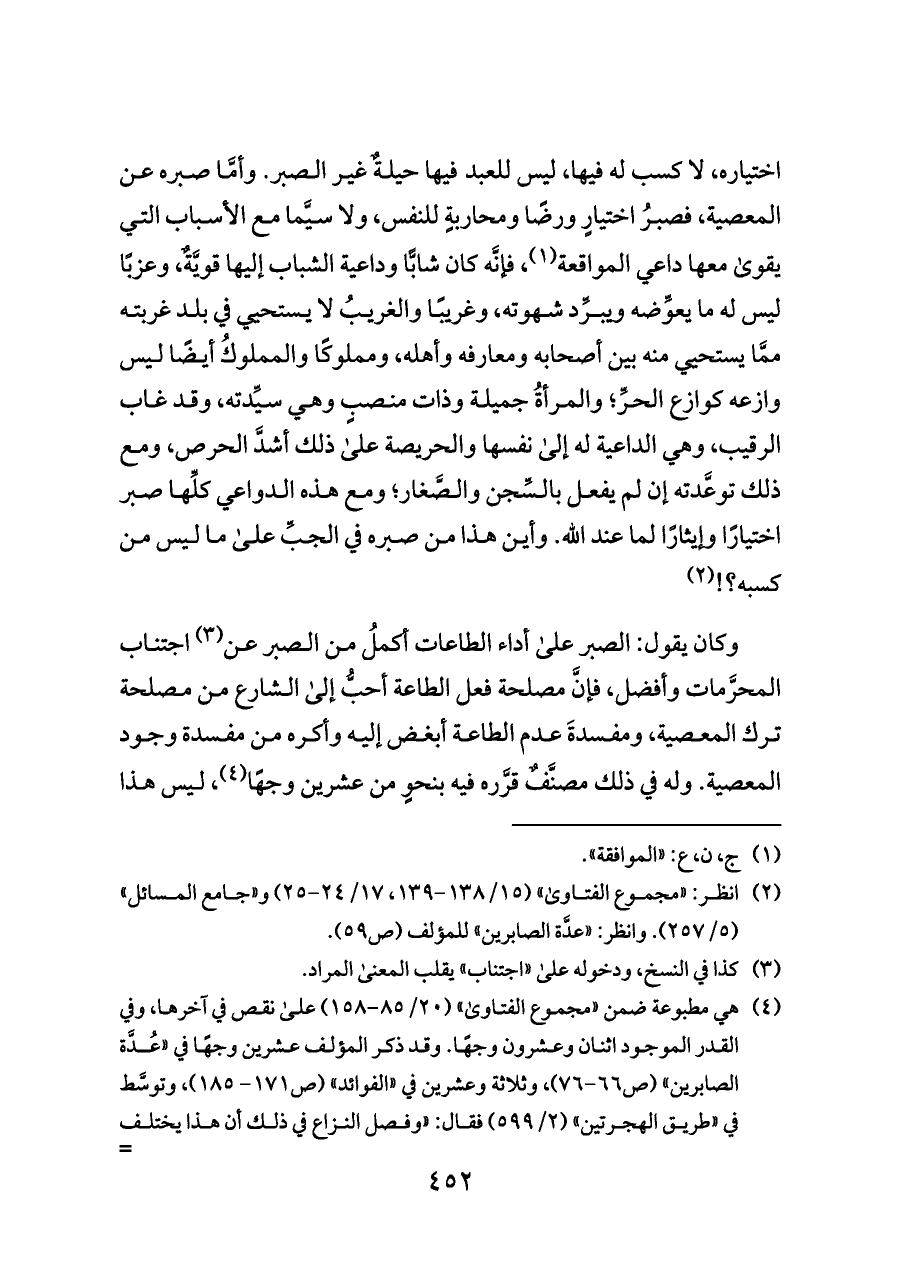 (¬٤) هي مطبوعة ضمن «مجموع الفتاوى» (٢٠/ ٨٥ - ١٥٨) على نقص في آخرها، وفي القدر الموجود اثنان وعشرون وجهًا. وقد ذكر المؤلف عشرين وجهًا في «عُدَّة الصابرين» (ص ٦٦ - ٧٦)، وثلاثة وعشرين في «الفوائد» (ص ١٧١ - ١٨٥)، وتوسَّط في «طريق الهجرتين» (٢/ ٥٩٩) فقال: «وفصل النزاع في ذلك أن هذا يختلف باختلاف الطاعة والمعصية، فالصبر على الطاعة المعظمة الكبيرة أفضل من الصبر عن المعصية الصغيرة الدنية، والصبر عن المعصية الكبيرة أفضل من الصبر على الطاعة الصغيرة».