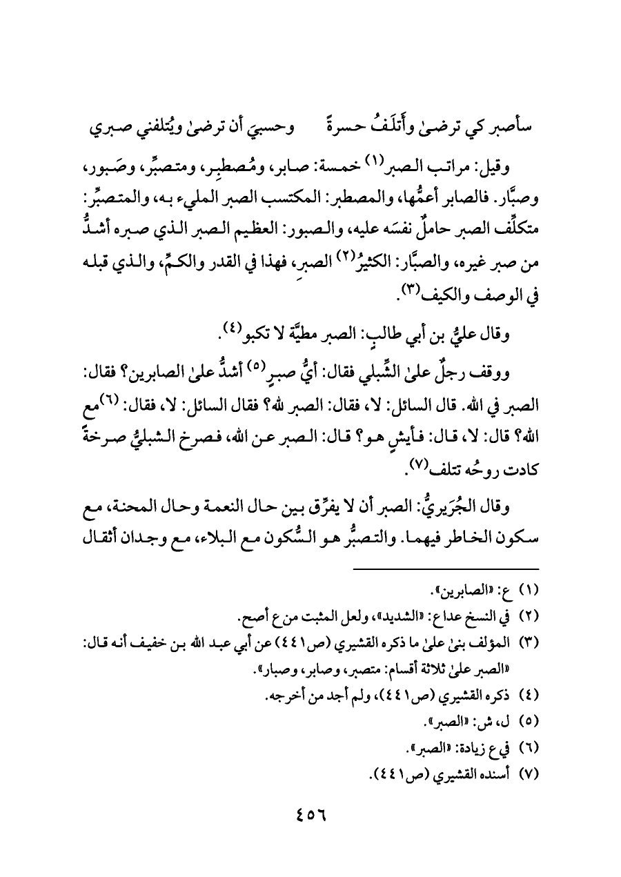 (¬٣) المؤلف بنى على ما ذكره القشيري (ص ٤٤١) عن أبي عبد الله بن خفيف أنه قال: «الصبر على ثلاثة أقسام: متصبر، وصابر، وصبار».