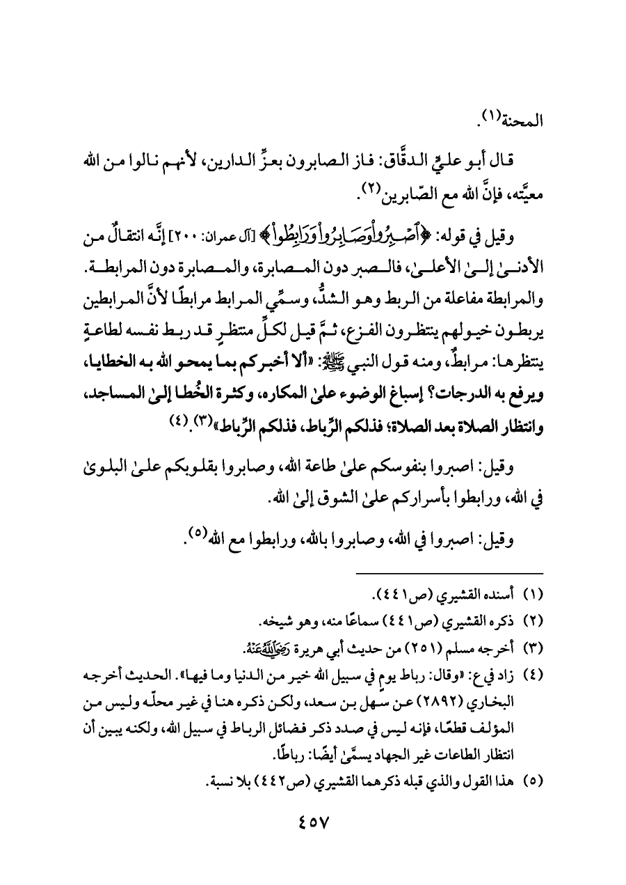 وقيل في قوله: {اصْبِرُوا وَصَابِرُوا وَرَابِطُوا} [آل عمران: ٢٠٠] إنَّه انتقالٌ من الأدنى إلى الأعلى، فالصبر دون المصابرة، والمصابرة دون المرابطة. والمرابطة مفاعلة من الربط وهو الشدُّ، وسمِّي المرابط مرابطًا لأنَّ المرابطين يربطون خيولهم ينتظرون الفزع، ثمَّ قيل لكلِّ منتظرٍ قد ربط نفسه لطاعةٍ ينتظرها: مرابطٌ، ومنه قول النبي - صلى الله عليه وسلم -: «ألا أخبركم بما يمحو الله به الخطايا، ويرفع به الدرجات؟ إسباغ الوضوء على المكاره، وكثرة الخُطا إلى المساجد، وانتظار الصلاة بعد الصلاة؛ فذلكم الرِّباط، فذلكم الرِّباط» (¬٣). (¬٤)
