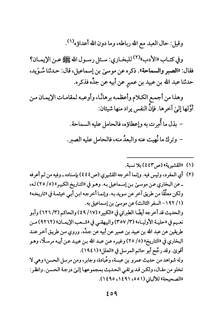 للبخاري: سئل رسول الله - صلى الله عليه وسلم - عن الإيمان؟ فقال: «الصبر والسماحة». ذكره عن موسى بن إسماعيل، قال: حدثنا سُوَيد، حدثنا عبد الله بن عبيد بن عميرٍ عن أبيه عن جدِّه فذكره.