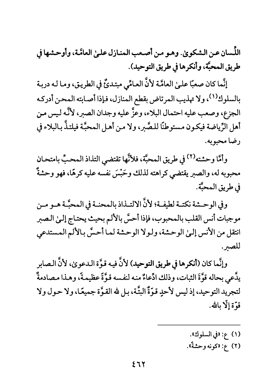 وفي الوحشة نكتة لطيفة؛ لأنَّ الالتذاذ بالمحنة في المحبَّة هو من موجبات أنس القلب بالمحبوب، فإذا أحسَّ بالألم بحيث يحتاج إلى الصبر انتقل من الأنس إلى الوحشة، ولولا الوحشة لما أحسَّ بالألم المستدعي للصبر.