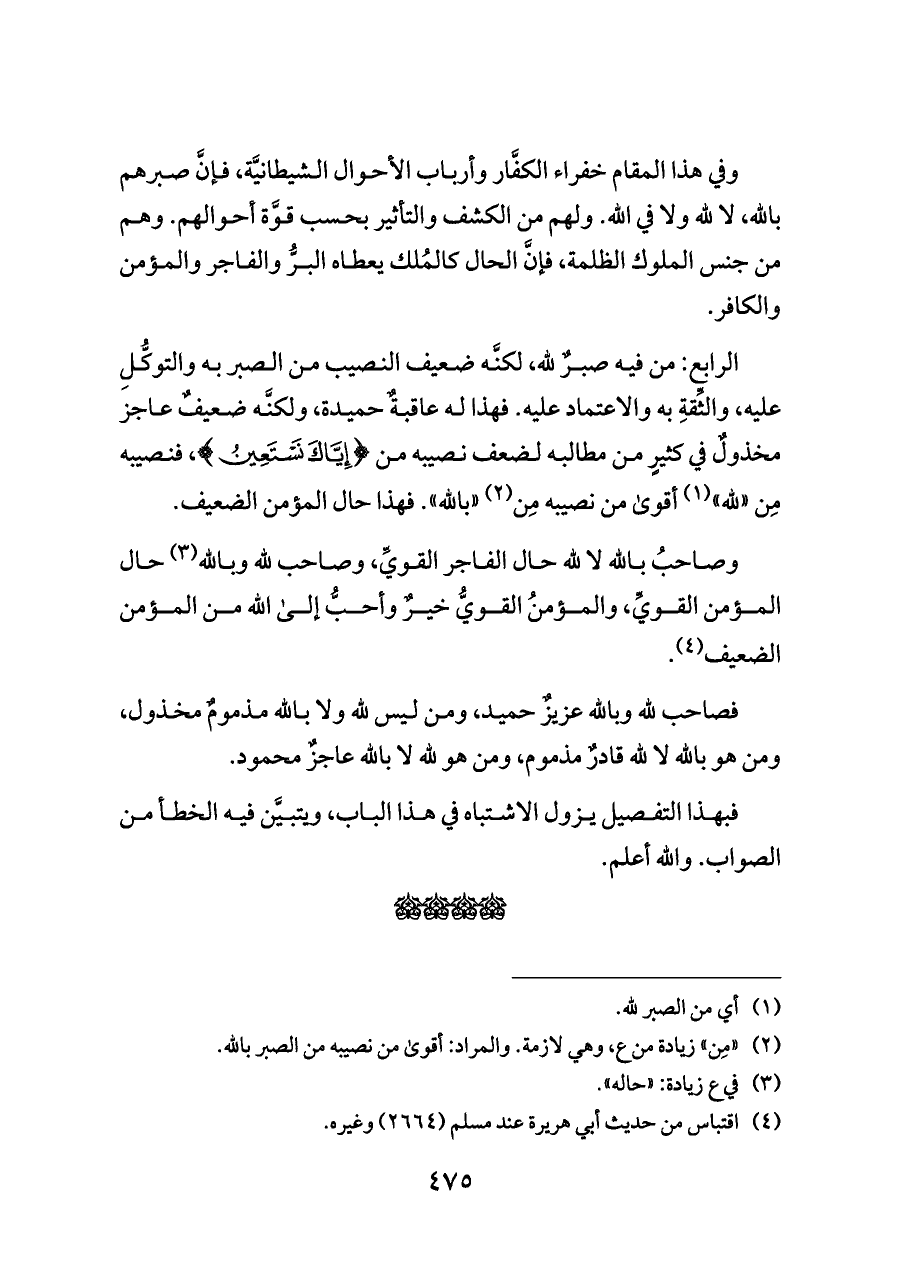 الرابع: من فيه صبرٌ لله، لكنَّه ضعيف النصيب من الصبر به والتوكُّلِ عليه، والثِّقةِ به والاعتماد عليه. فهذا له عاقبةٌ حميدة، ولكنَّه ضعيفٌ عاجز مخذولٌ في كثيرٍ من مطالبه لضعف نصيبه من {إِيَّاكَ نَسْتَعِينُ}، فنصيبه مِن «لله» (¬١) أقوى من نصيبه مِن (¬٢) «بالله». فهذا حال المؤمن الضعيف.