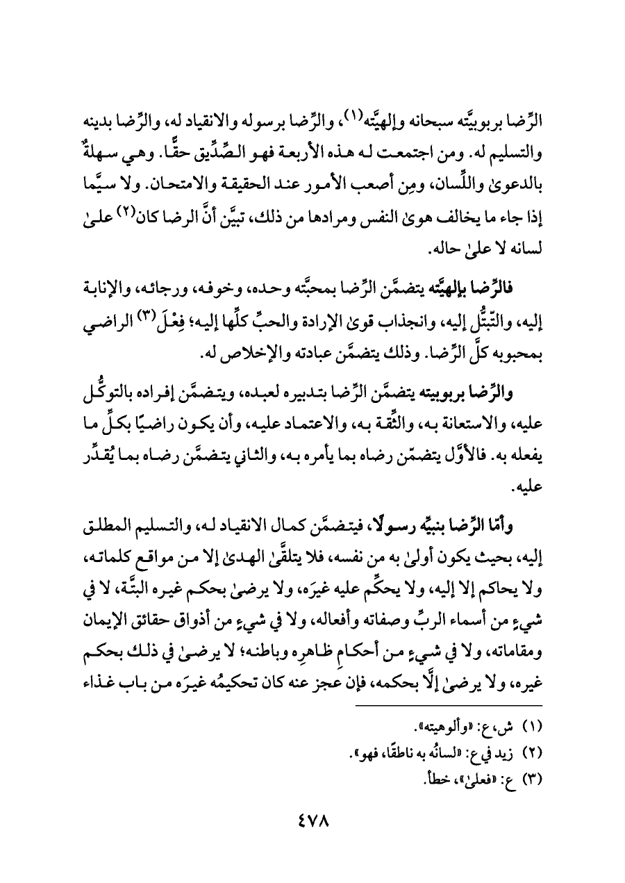 فالرِّضا بإلهيَّته يتضمَّن الرِّضا بمحبَّته وحده، وخوفه، ورجائه، والإنابة إليه، والتّبتُّل إليه، وانجذاب قوى الإرادة والحبِّ كلِّها إليه؛ فِعْلَ (¬٣) الراضي بمحبوبه كلَّ الرِّضا. وذلك يتضمَّن عبادته والإخلاص له.