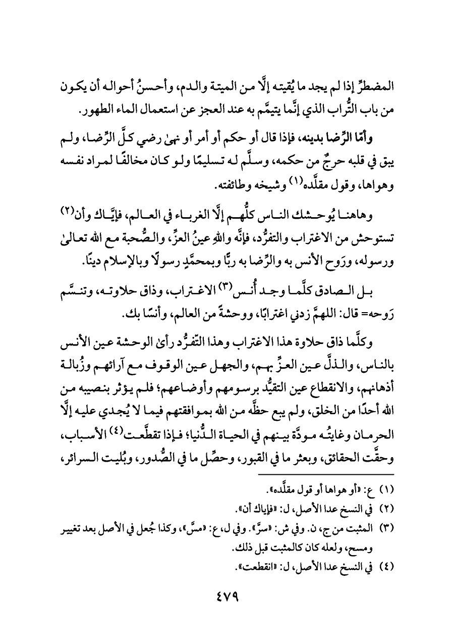 وهاهنا يُوحشك الناس كلُّهم إلَّا الغرباء في العالم، فإيَّاك وأن (¬٢) تستوحش من الاغتراب والتفرُّد، فإنَّه واللهِ عينُ العزِّ، والصُّحبة مع الله تعالى ورسوله، ورَوح الأنس به والرِّضا به ربًّا وبمحمَّدٍ رسولًا وبالإسلام دينًا.